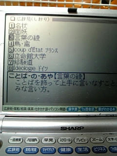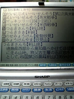 私は辞書大好き人間です。 辞書があれば暫く遊んでいられます。 で、趣味が凄くわかりやすい履歴。 国萌えと山萌えばっか!(笑) 百科事典はこれです。時期によって飛鳥時代だったり薬だの麻薬だのアルカロイドだのばっかりだったりもします。 百科事典は世界史で埋まりやすい…広辞苑はたまに哲学用語ばっかりだったりもする。 1番笑えるのは英語(笑) 広辞苑。言葉の綾とか調べてる所をみるとレトリックについて考えてた時だろうに前後に調べてる事が全然関係なかった(笑) 修辞法と修験道を間違えて入力…んなわけないか。 知ってる事も何度も繰り返して引いたり、意味なく思いついた言葉を引くのが好きです。 あと漢字辞典は超たのしい!熟語が超たのしい! あったらいいのに、ってのも引く。残念ながらカカナルという言葉はありませんでした。 情報提供:相方 PR この記事にコメントする