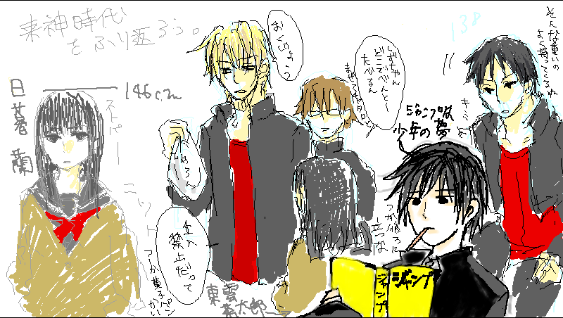 大佐→東雲 茶太郎(しののめちゃたろう) 蘭々→日暮 蘭(ひぐらしらん) ■クラス割り 1年1組:折原臨也/東雲茶太郎 1年2組:平和島静雄/岸谷新羅/日暮蘭 ■委員会 風紀委員:折原臨也 図書委員:平和島静雄/東雲茶太郎 保健委員:岸谷新羅/日暮蘭 ■服装 乱れ組:折原臨也/平和島静雄/日暮蘭 キッチリ組:岸谷新羅/東雲茶太郎/門田京平 ■選択科目 美術:平和島静雄/東雲茶太郎/日暮蘭 書道:折原臨也/岸谷新羅/門田京平 ◎茶太郎 蘭とは幼馴染。来神高校に通い臨也と同じクラスに在籍。 基本前向きなお調子者。空気読まない。 男寄りの顔つき(父親似)で割りと背が高い イザヤと仲が良いのでクラスで浮いた存在だが持ち前の鈍さで気にしない。 料理の腕はポイズン。(ごめん) 最近の悩みは蘭と臨也が急接近している(ように見える)こと ◎蘭 茶太郎とは幼馴染。来神高校に通い静雄と新羅と同じクラスに在籍。 身長が小学生のころから止まっている。 クラスで浮いた存在の静雄が気になって勝手に付きまとう日々。 お菓子は作れる。料理はしない。 臨也と仲が悪い。 最近の悩みは幼馴染があやしい人(臨也)とつるんでいるということ ■運動神経の順 1位:静雄 2位:臨也(一番足が速い) 3位:蘭 4位:茶太郎 5位:新羅 蘭は運動神経が悪いですが、いかんせん新羅が悪すぎるので3位という高順位です。2位と3位の差が劇的です。 ■テスト前には勉強会があります(おもに静雄のために) 茶太郎、蘭、静雄は文系。新羅と臨也は理系(臨也は文系でもいける) 英語・国語に関しては茶太郎と蘭は偏差値70前後なので教える側に回りますが 茶太郎の理科は圧倒的にやばいので岸谷先生に教えて頂きます。 蘭の数学はさんすうレベルなので岸谷先生に(略) 蘭「3けたのひきざんとかできない」 茶「おい生物教えろよ先生」 新「何で極端にそこだけレベル低いかな君たち」 教え方としては蘭>茶なので、静雄には主に新羅と蘭がつきます。 ■余談 蘭「シズちゃんは音痴だよ」 蘭「でも演歌だけ異常にうまい」 茶「臨也は無駄にはやりのJPOP知ってるよ。あと洋楽歌う。」 ■スプラッタ映画を鑑賞しました 新羅→ひたすらケチをつける(血液の表現とか) 臨也→ひたすらケチをつける(精神状態とか) 蘭「おまえら素直に映画を楽しめ」 茶「つうか、もっと和やかなの見ようよ…ジブリとか」 静「ジブリ…いいな…」 蘭「トトロがいい、トトロ」 茶「カントリーロードだろJK」 蘭と静雄はトトロの存在を信じています。 臨「見ろ!駒がゴミのようだ!!」 ・基本的に新羅の語るセルティの話をただの妄想だと思って聞いています(蘭・茶太郎) ・オスカーワイルドの話題で盛り上がる嫌な高校生>茶太郎・臨也 ・日向ぼっことトトロで盛り上がる幼い高校生>蘭・静雄 ・臨也と茶太郎はとても仲良しですが、蘭は臨也を紹介された瞬間からなんかこの人うざいと思っています(口には出しません) ・茶太郎はそんな蘭の気持ちに気付きません(KY) ・新羅は解ってて口出しません(AKY) まっさーおみ!\(^o^)/