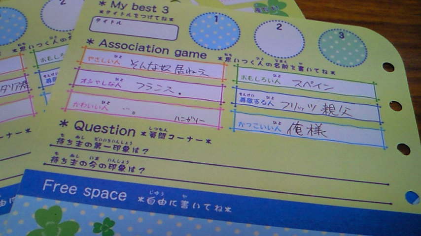 うわあああん鯉さんありがとうございます! ほんと、もえしにました。どうしよう、私は悪友トリオを描けるようにならなくてはいけない。 一生大事にしまぶくぶくぶく…… 絵の練習をせねば、と思う今日このごろです。 あと、今日昼(?)から知り合いが服屋を案内してくれとのことで、 いってきますが、その見返りに 国語学のテストの対策プリントを要求した私はちゃっかりしすぎだと思います。 これ、持って行ったら、多分、ほとんど解ける。わーい! テスト前の貴重な休みですもの。えへへ。 あー、悪友トリオいいなあ。 っていうか、スペインいいなあ。スペインまじですきやわぁー あと、プ ロ イ セ ン か わ い い