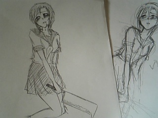 それはそうと相方がさっきメッセで 金尾: 仏:たまには墺が食いたいでぇす 金尾: 仏:いっそ食われてもいい。 蘭々: wwwwwwwwwwwwwwwwwwwwwwwwwwwwww 金尾: 仏:せめて「bんsdfぐぢりょふy」とか言わない墺が 金尾: 仏:いいです 「bんsdfぐぢりょふy」ってwwwwwww それは私が仏墺やるたびにラリって落ちることを言ってるんでしょうか^qq^^q^ 相方を米受けに染め上げようとおもったんですがちょっと無理がありました。 PR 一昨年の六月に描いていたらしいカカナル。 絵板で日記をやってたころの絵です。昔の日記あさってたら今見つけた。 これ凄くお気に入り。愛しい、幸せ!っていうのをきちんと描けたなって。 気持ちが溢れてくるような絵を描きたいってずっと昔から思ってる。 悲しいとか恐ろしいとか愛してるとか幸せとか、 言葉でさくっとかいてしまうけどその感情の深さってはてしないよね。 どうしてもどうしても体から溢れてくるような、押さえきれず絵からにじみでてくるような、 そんなものを描きたいとずっと思っている。 ろぐ引用してみると >あかん、あたしやっぱものっそいカカナル好きだ!!笑。 何でほかのひとがかいたカカナルって萌えるんだろうなー、なぞ。もうひっさびさに絵とかかいちゃった! しぁあせそーな二人を。 お気に入りかもしれない。えへへー 蘭々 : 2006/06/15 (木) 20:42/ 描画時間 : 11分52秒 12分で描けたりするんだな(笑) ふたつくらいまえの記事に書いたのでいう、「一番最初に描いたイメージ」状態なんだろうなぁこれは。 私は頭の中に「モノ」としてイメージが浮かんでくることが本当に少ない。だから絵とかいうものにはものすごくしにくいんだな。 凄く抽象的で、形が浮かんでくることはほとんどない。そのとき思い浮かべているものが感情だからなんだろうけど。 描こうとしたらきっと抽象画になっちゃうんだろうな。抽象を具体になおしたときにできあがるのが私の絵なんだけども、その絵がより抽象に近いときに気に入るのかな、 いや、抽象に近いわけじゃなくて、その抽象としての感情が、人間やキャラクターの表情だとか、それにわかりやすく反映されるがのがいっかいめにかいたものなんだろうな。 バランスとかそんなものはどうでもよくて、怒っているならおそろしく目はつりあがっているし、体は何か表現したいところだけ大きく大きくかかれている。 私はそんな自分の絵を一番気に入ったりする。バランスの悪さやみばえの悪さにげんなりしたりするわけだけど、それでも私がぱっとみて受けるその絵のイメージは一番気に入るものになる。 蘭々さんはわかりやすくレナ大好き病です。 私はだいたい絵をかくとき、最初に右みたいにイメージをかいて、あとで左みたいに写してかきなおします。これが下書きになります。 でも大体、最初にかいたものの方が表情や向きが理想的です。 なのでたまに試行錯誤のすえ思い通りのものが描けずに、最初にかいたままを清書に使ったりもします。 歎きノ森きいてたらもうひぐらしかきたくてかきたくて 西英西が描きてぇぇええ^^^^^^qqqqqqq^